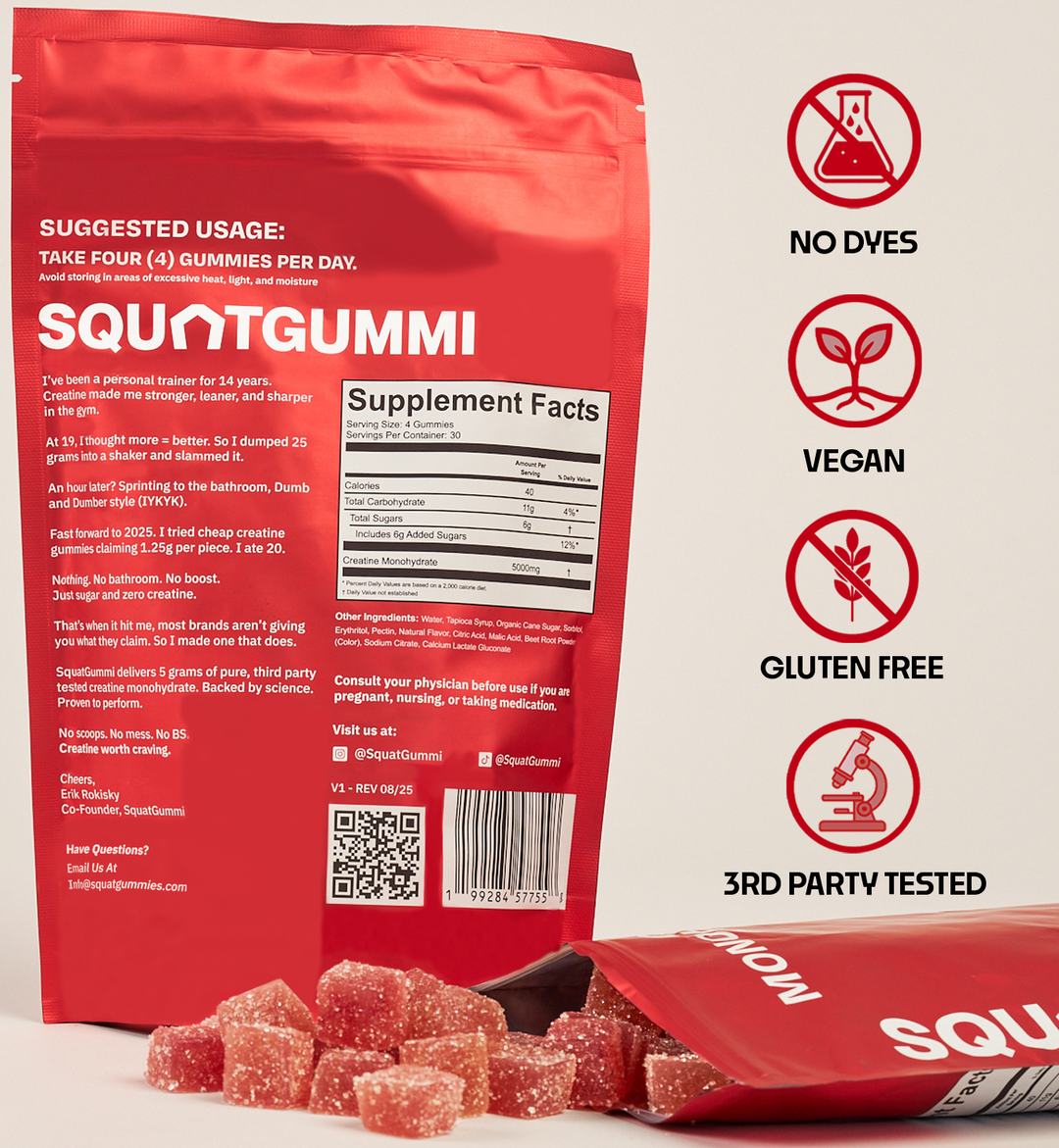 Our creatine gummies deliver premium, fast-absorbing creatine in a format that’s as easy as it is effective. No powders. No water. Just grab, chew, and go. Formulated with high-quality ingredients and zero fillers, SquatGummies support muscle growth, strength, and recovery, without